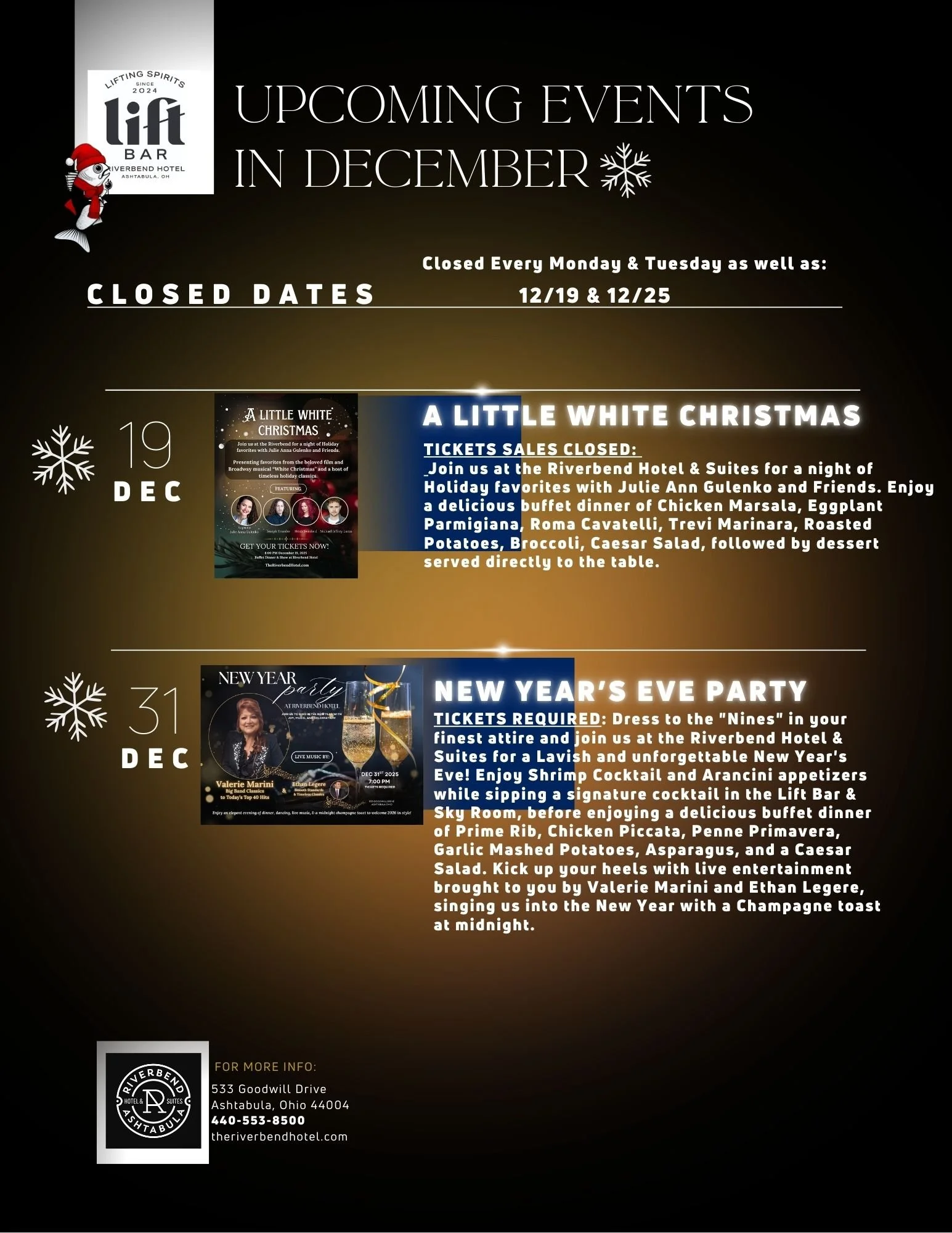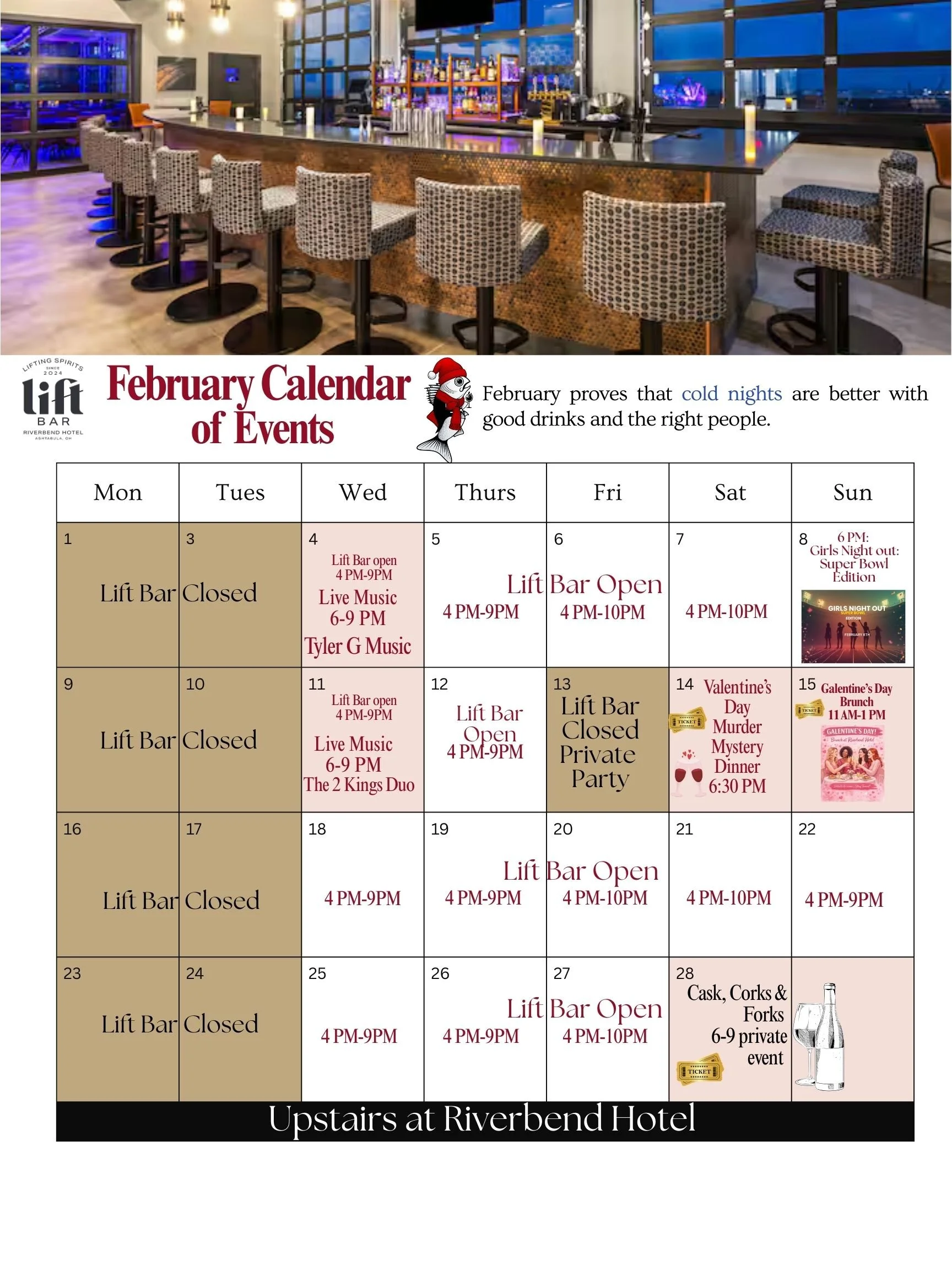 Stay connected with everything going on at The Lift Bar and Riverbend hotel! Our Calendar of Events is your go-to guide for upcoming happenings—whether you're looking for community celebrations, seasonal festivals, live entertainment, or special events hosted right here. From can't-miss experiences to local favorites, there's always something exciting on the horizon.